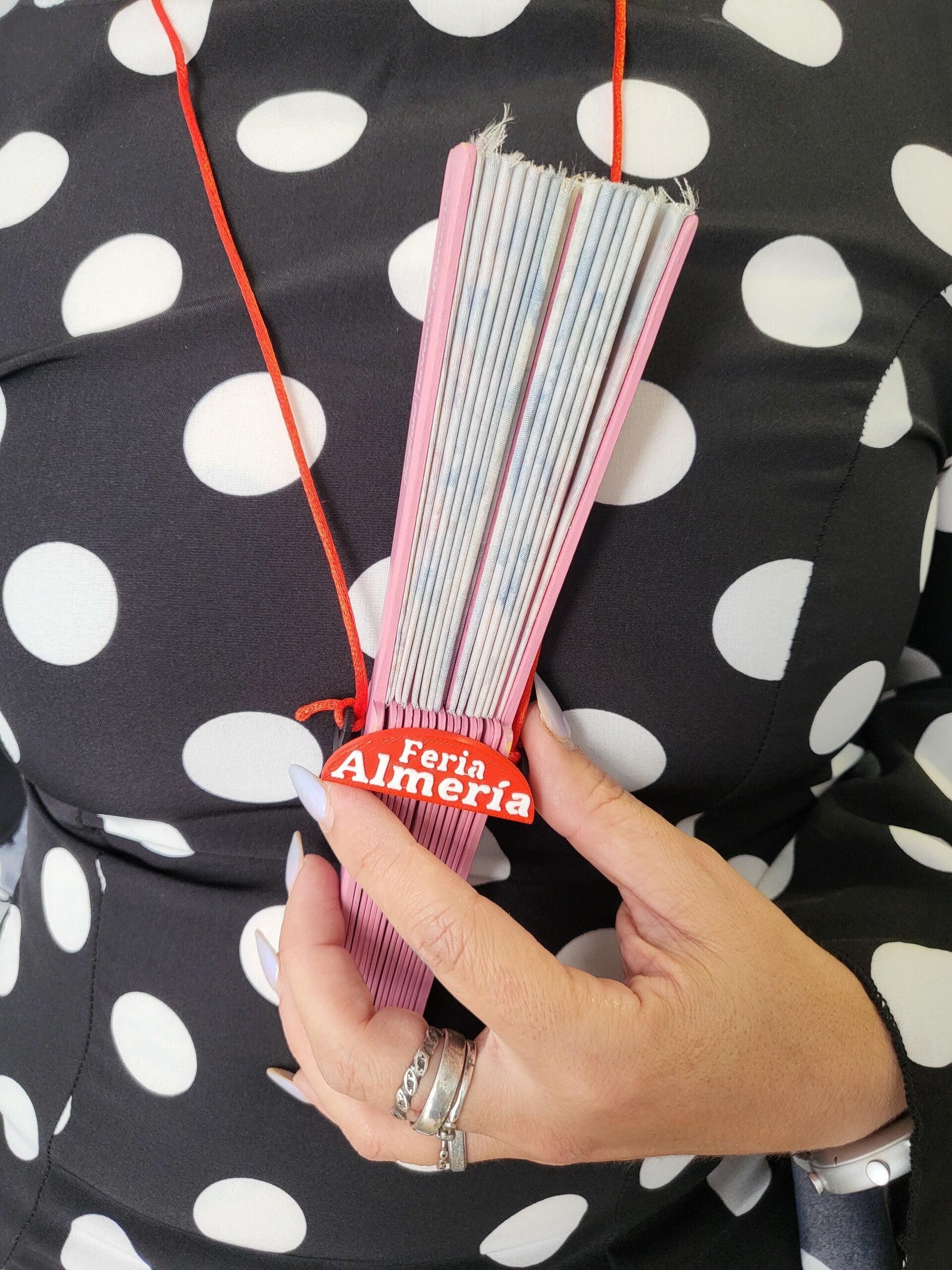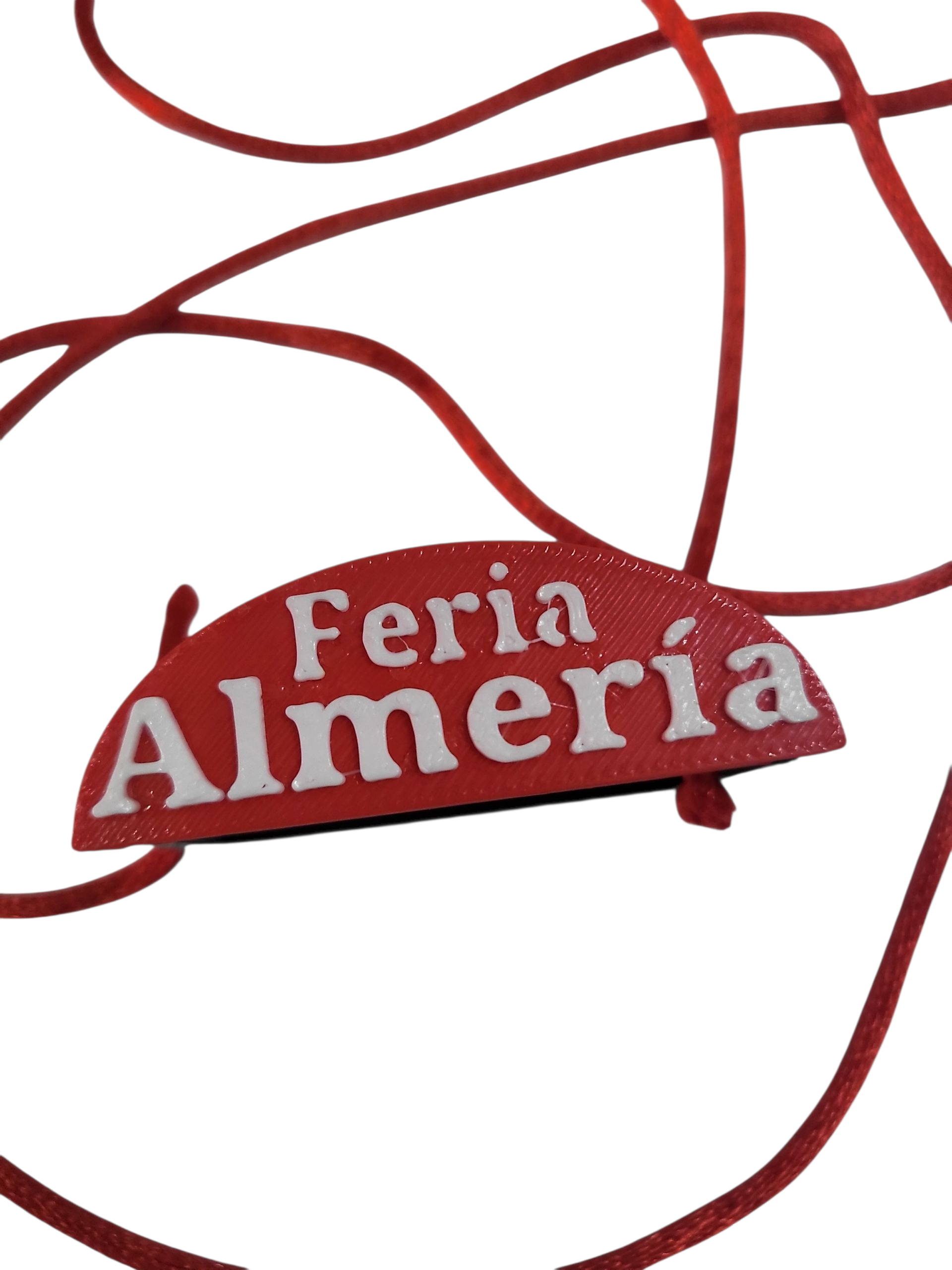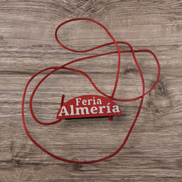 Porta abanico con el fondo rojo, con letras en blanco y cordón rojo, fabricado en 3D, apto para todos los modelos de abanicos.