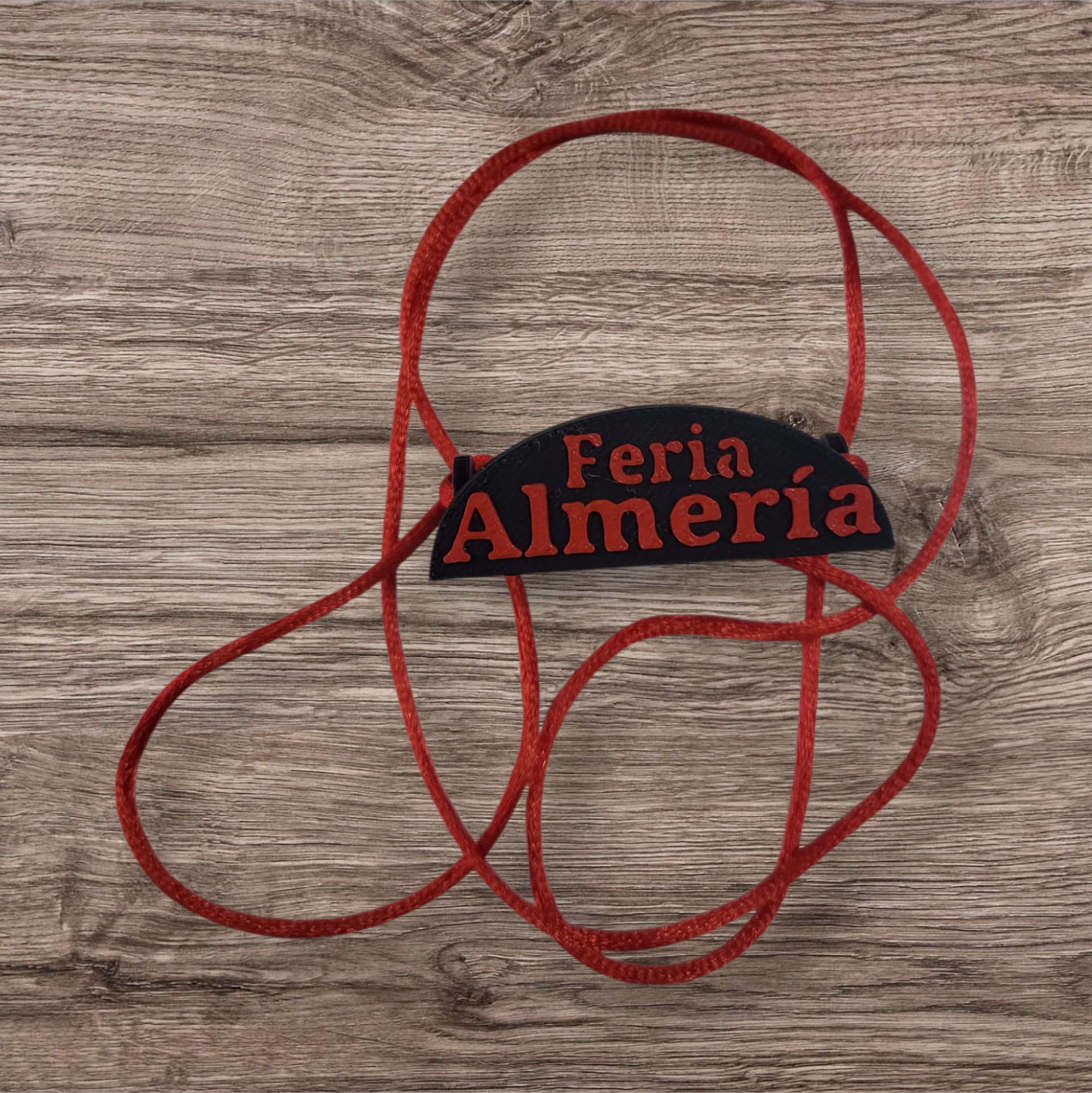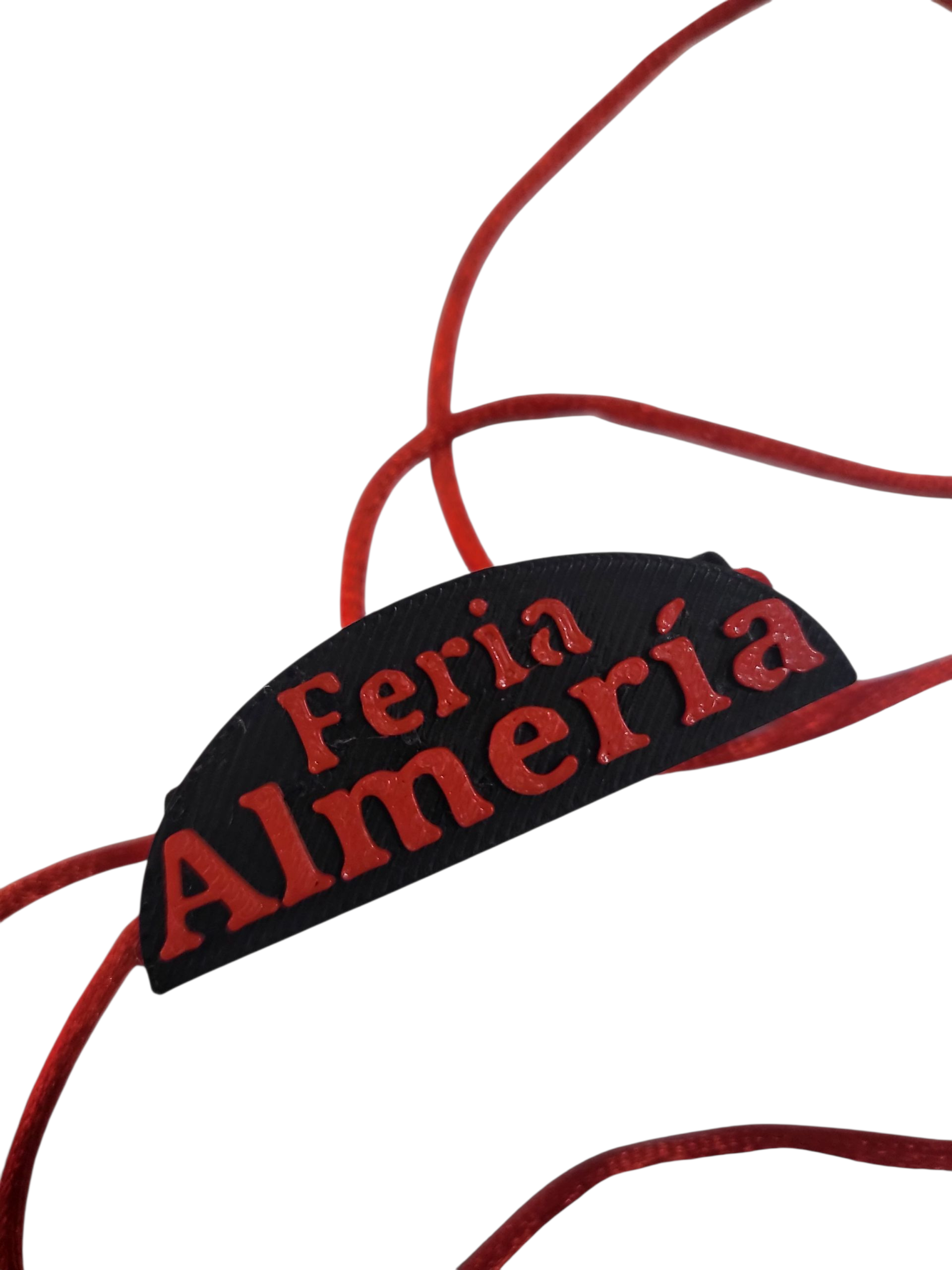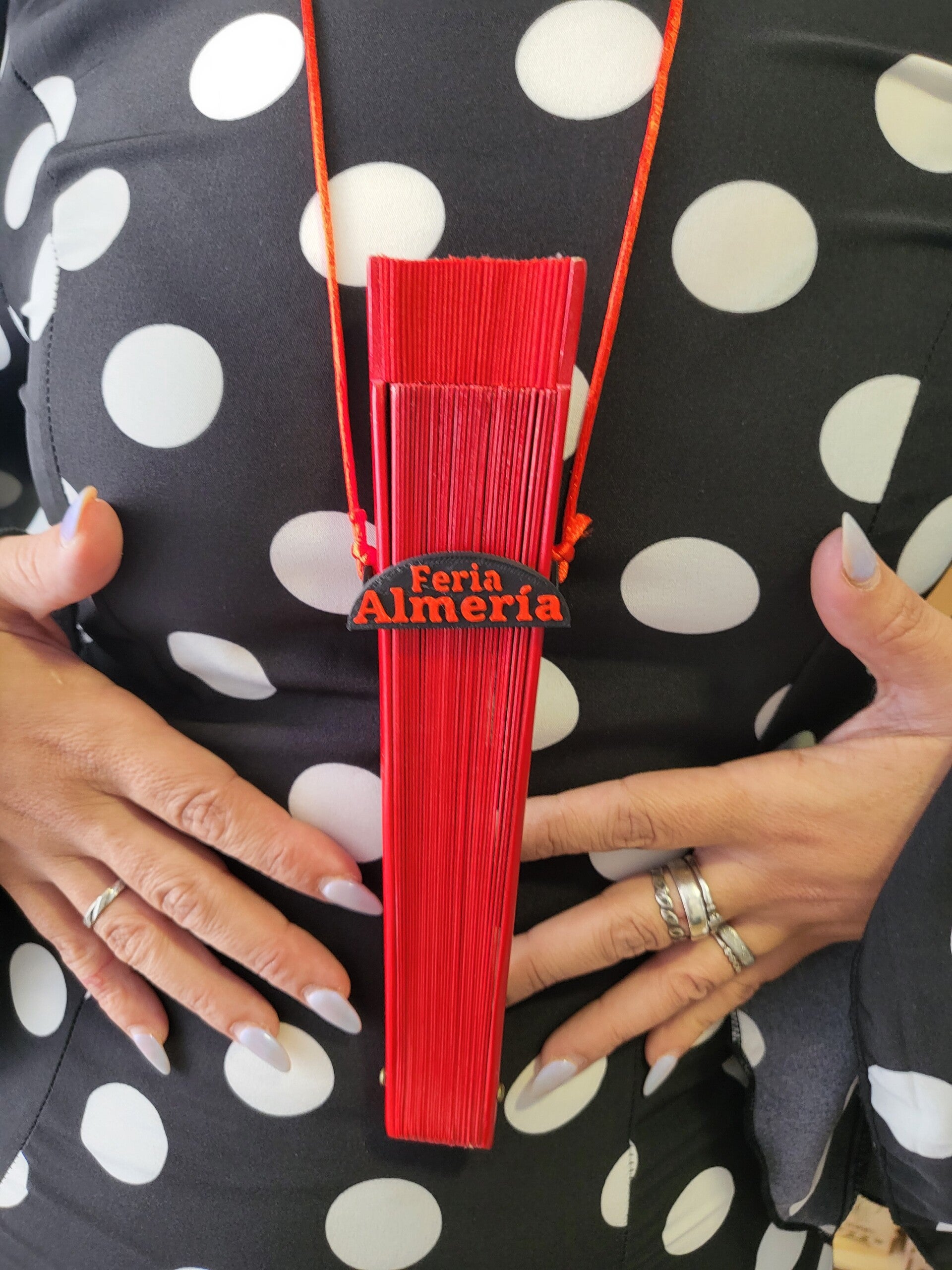 Porta abanico con el fondo negro, con letras en rojo y cordón rojo, fabricado en 3D, apto para todos los modelos de abanicos.