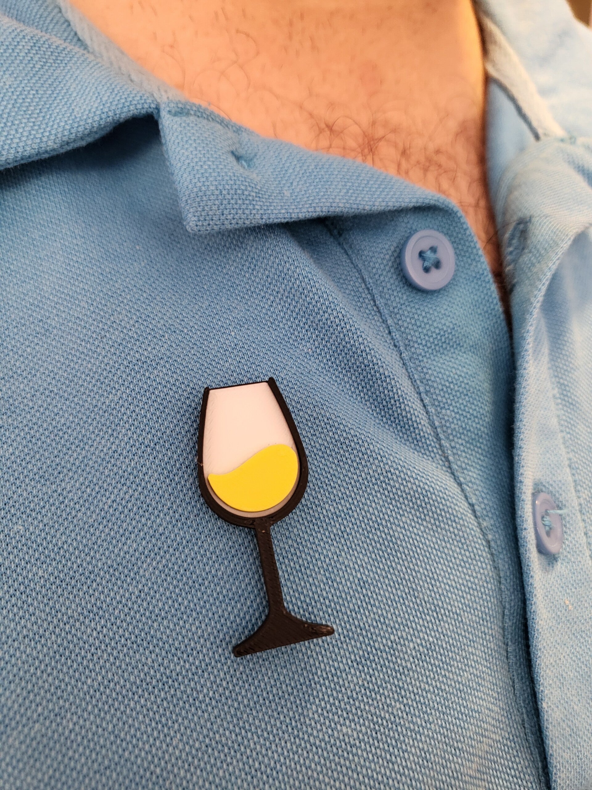 Pin en forma de copa de fino en color blanco,amarillo y negro. Fabricado en 3D y broche metal en dorado.