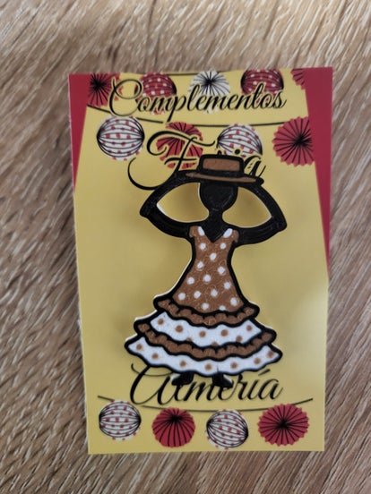 Pin en forma de indalo con vestido de flamenca en color marrón con lunares blancos. Fabricado en 3D y broche metal en dorado.